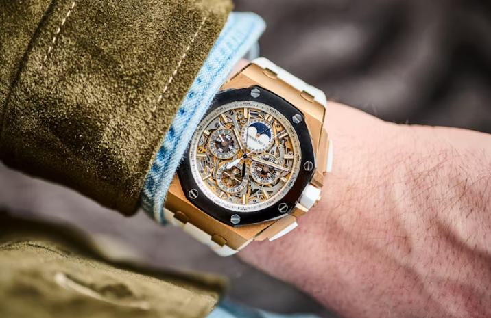 This is one of the rarest birds in Audemars Piguet’s catalog, something that the brand only trots out in limited edition runs: a Royal Oak Grand Complication. Not only that, but it’s an offshore and semi-openworked one. I’ve been obsessed with these watches for a while because of their absurdity: 44mm wide, 15.70mm thick, a skeletonized watch with a perpetual calendar, moon phase, leap year indicator, split-second chronograph, and minute repeater. If the original Offshore was called “The Beast,” what do you even begin to call this watch, one that eats up your wrist and weighs you down? I’m going with Jörmungandr – the world serpent eating its own tail in Norse mythology.