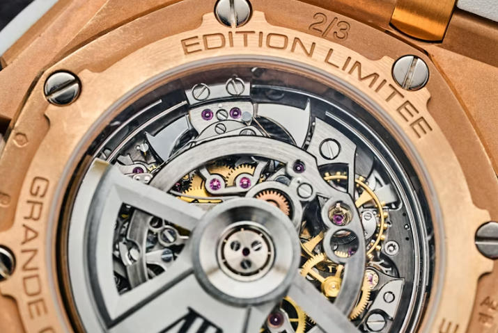 As I mentioned in the story on the Concept, the biggest achievement in that high quality clone watches (that trickled down from the RD#4) is a reimagining of the split-seconds mechanism and rotor. Any split-second work will grip the center wheel to stop one of the chronograph hands (or both), and previously, it was naturally placed under the rotor and bearing, allowing the rotor to swing freely. The downside of stacking these mechanisms is the added thickness. However, the new design from AP nestles the works inside the rotor bearing, simplifying things and allowing for a thinner profile.